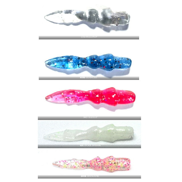 シラスパターンにベストマッチする、シラスをイミテートしたワームです。アクション時にテールがあたかもシラスが泳いでいるときのような波動を産みだします。