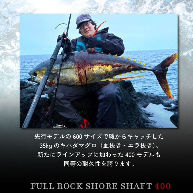先行モデルの600サイズはロックショアで35kgのキハダマグロ(血抜き・エラ抜き)をランディングした驚異の耐久性を誇ります。