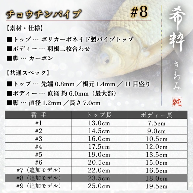 パイプトップならではのキレのあるアタリでリズミカルな釣りを楽しめるウキとなっています。
