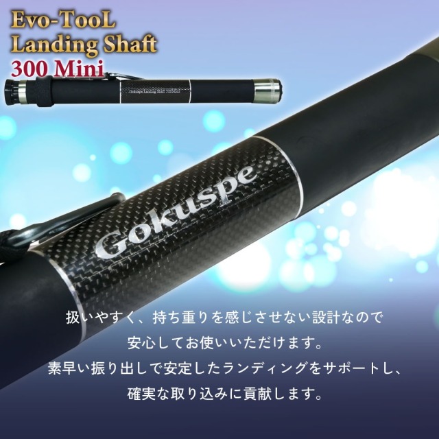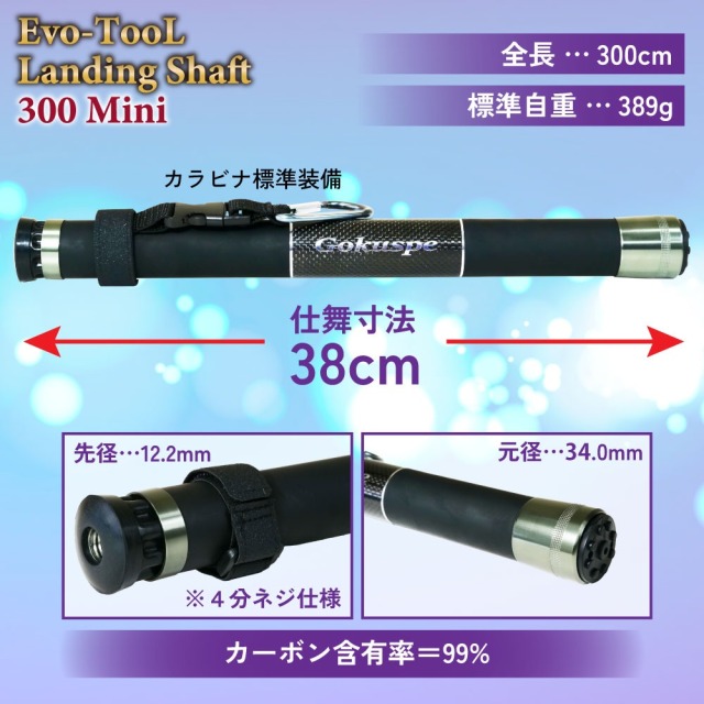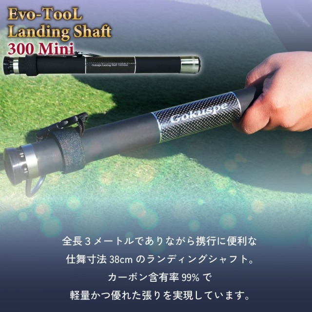 全長3mでありながら携行に便利な仕舞寸法38cmのランディングシャフト。カーボン含有率99%で軽量かつ優れた張りを実現しています。