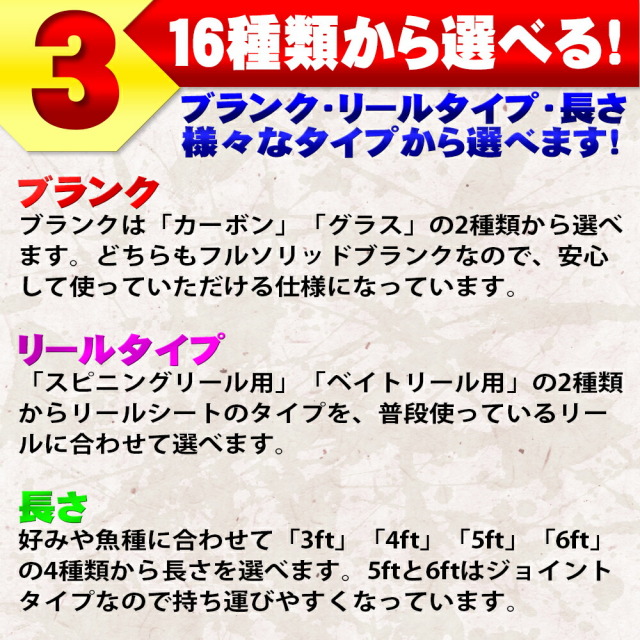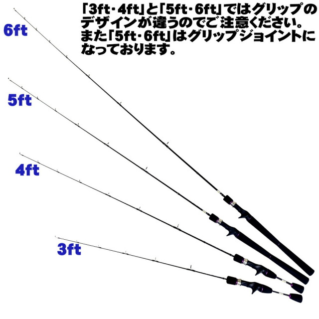 種類も長さが「3ft(90cm)/4ft(120cm)/5ft(150cm)/6ft(180cm)」の4種類から選べるだけでなく、リールのタイプに合わせて「ベイトタイプ/スピニングタイプ」から選べます!