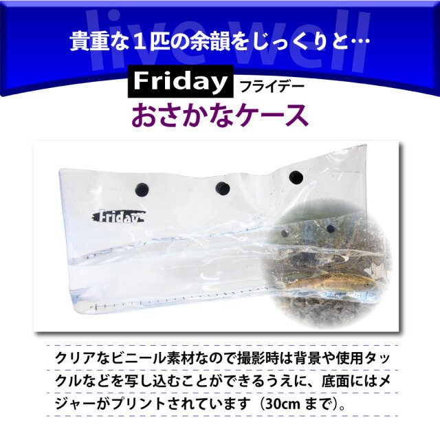 さらに、クリアなビニール素材なので撮影時は背景や使用タックルなどを写し込むこともできるなど、釣りをいっそう楽しくしてくれるアイテムです。