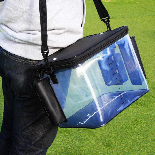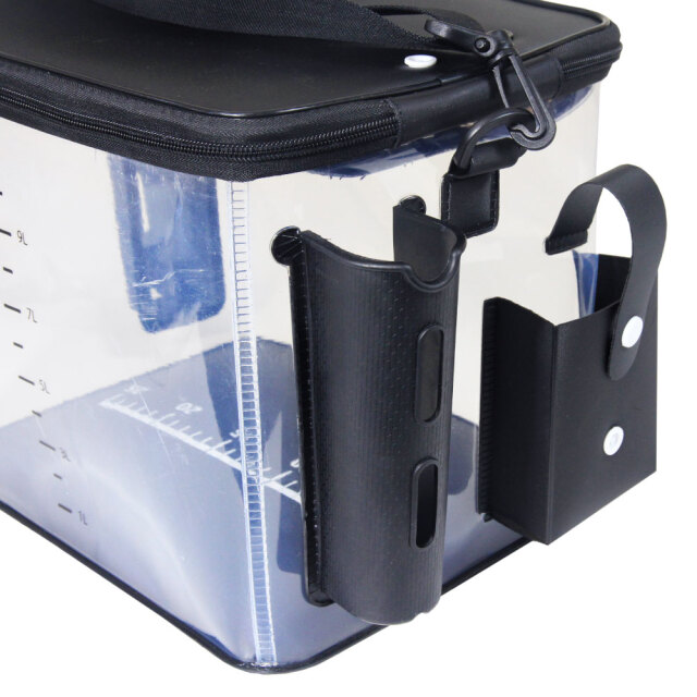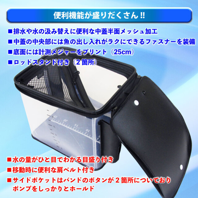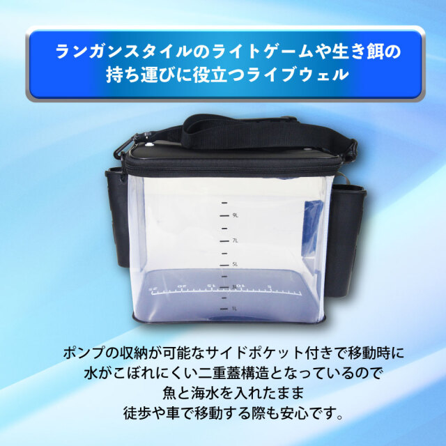 ポンプが収納可能なサイドポケット付きで、移動時に水がこぼれにくい二重蓋構造となっているので魚と海水を入れたまま徒歩や車で移動する際も安心。