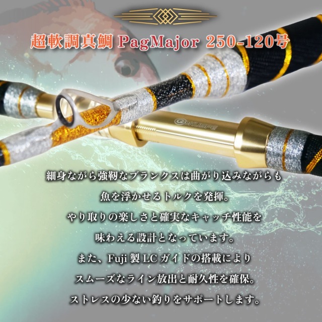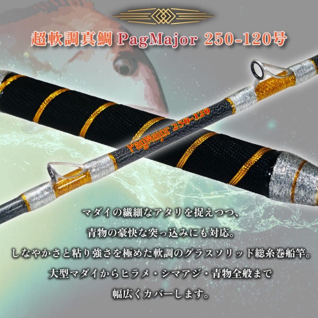 マダイの繊細なアタリを捉えつつ、青物の豪快な突っ込みにも対応。しなやかさと粘り強さを極めた軟調のグラスソリッド総糸巻船竿。大型マダイからヒラメ・シマアジ・青物全般まで幅広くカバー。手持ちスタイルでの釣りに最適な絶妙なバランスを実現しました。
