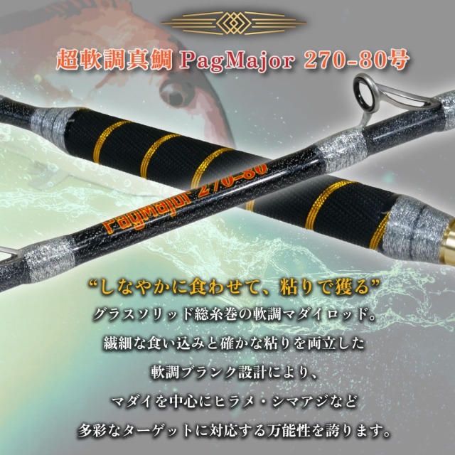 しなやかに食わせて、粘りで獲るグラスソリッド総糸巻の軟調マダイロッド。繊細な食い込みと確かな粘りを両立した軟調ブランク設計により、マダイを中心にヒラメ・シマアジなど多彩なターゲットに対応する万能性を誇ります。