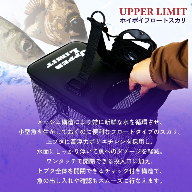 上ブタに高浮力ポリエチレンを採用し、水面にしっかり浮いて魚へのダメージを軽減。ワンタッチで開閉できる投入口に加え、上ブタ全体を開閉できるチャック付き構造で、魚の出し入れや確認もスムーズに行なえます。