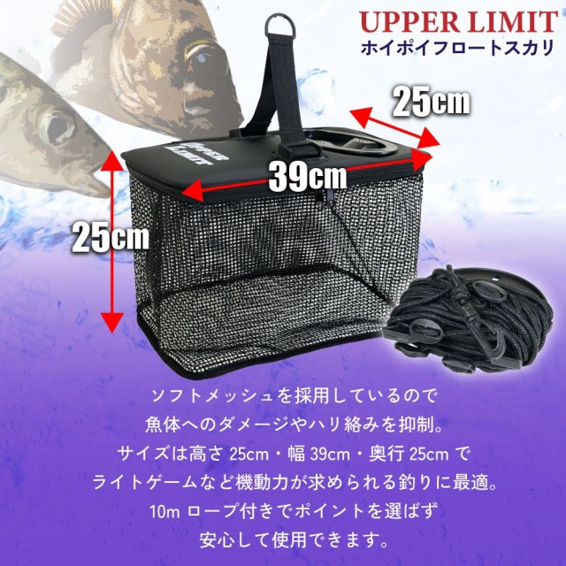 ソフトメッシュを採用しているので魚体へのダメージやハリ絡みを抑制。サイズは高さ25cm・幅39cm・奥行25cmでライトゲームなど機動力が求められる釣りに最適。10mロープ付きでポイントを選ばず安心して使用できます。