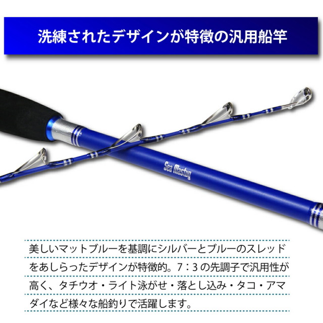 美しいマットブルーを基調にシルバーとブルーのスレッドをあしらい、洗練されたデザインが特徴的な船釣り用フルグラスソリッドロッドです。