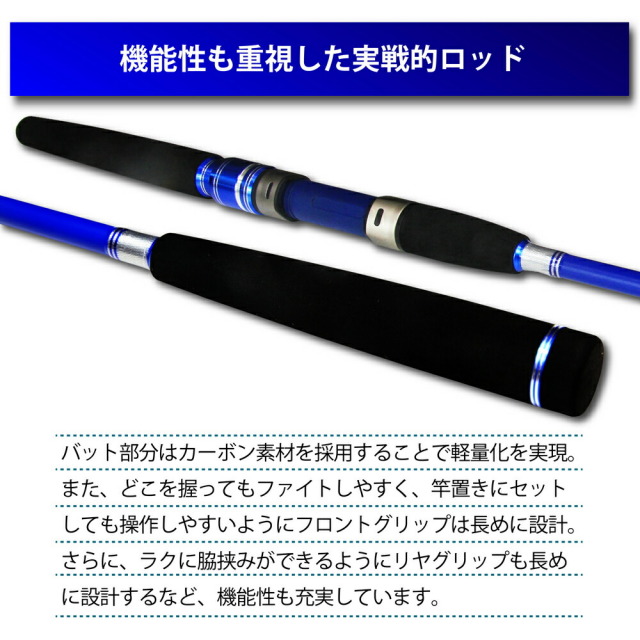 バット部分はカーボン素材を採用することで軽量化を実現。また、どこを握ってもファイトしやすく、竿置きにセットしても操作しやすいようにフロントグリップは長めに設計。